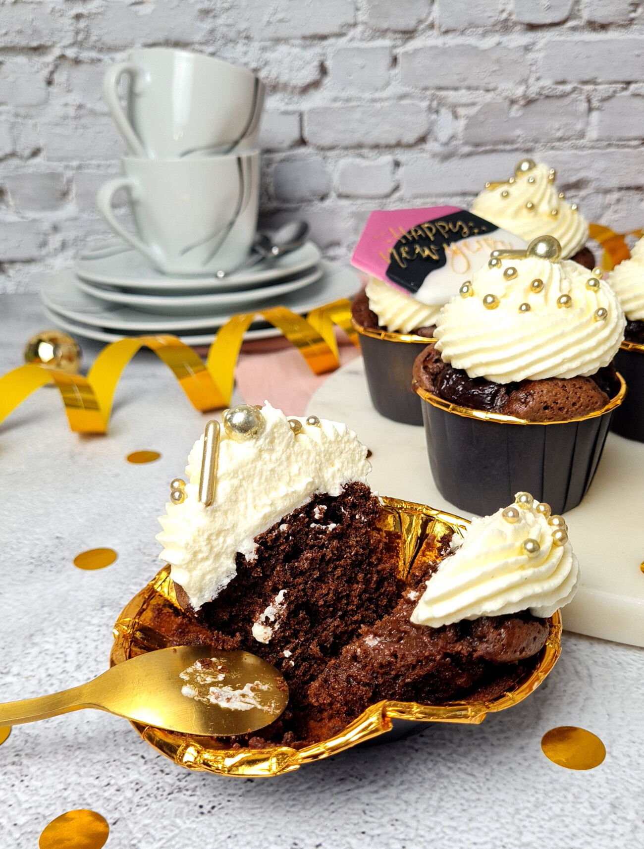 Zum Schluss werden die Cupcakes mit dem Frosting, den goldenen Zuckerperlen und der vorbereiteten Fondant-Dekoration verziert und passend zum Jahreswechsel serviert.