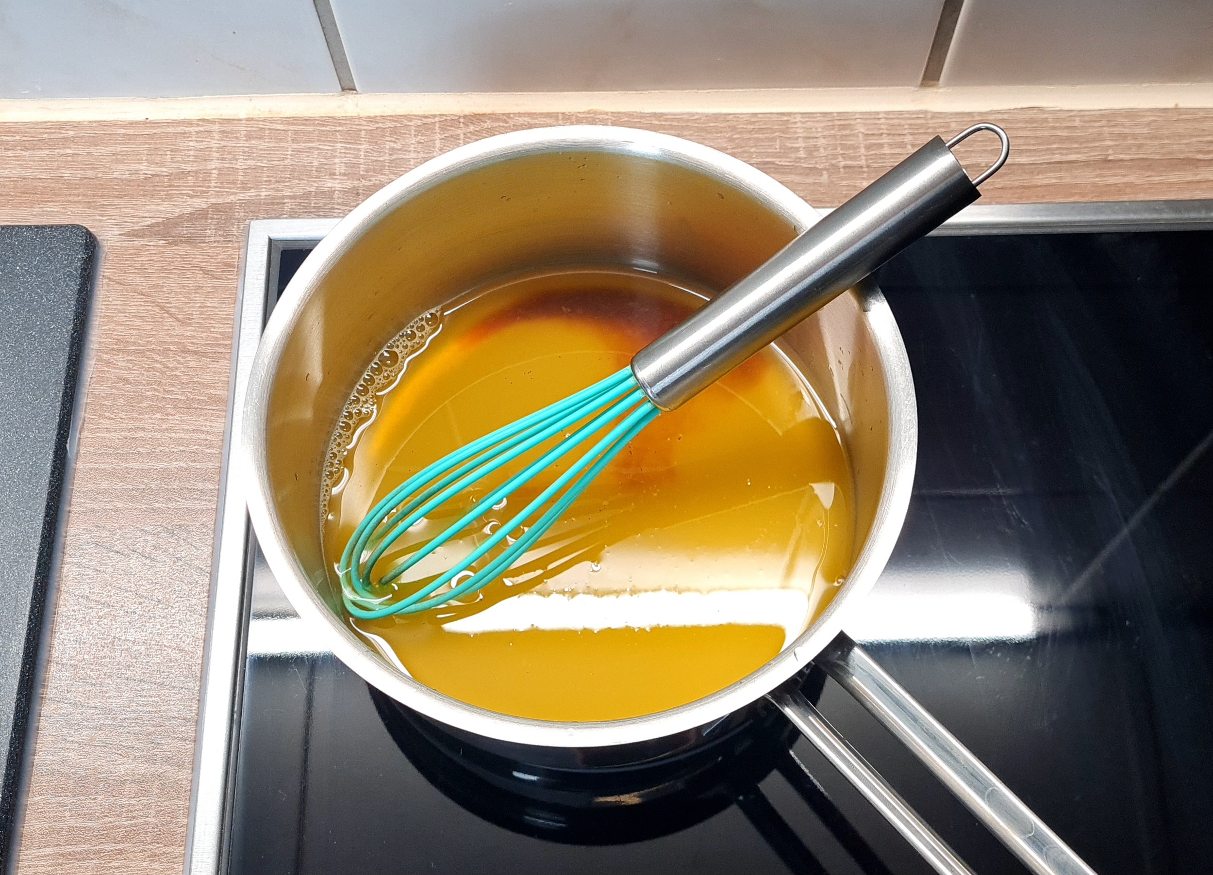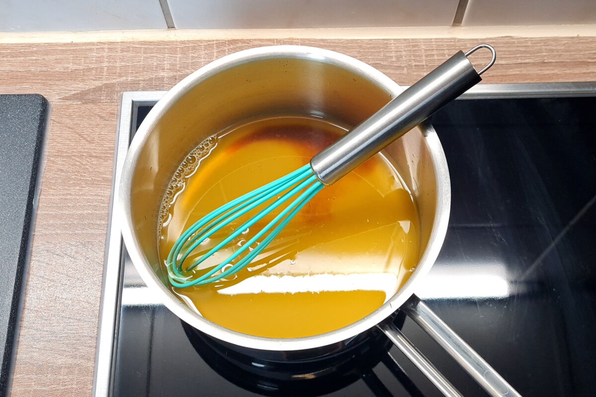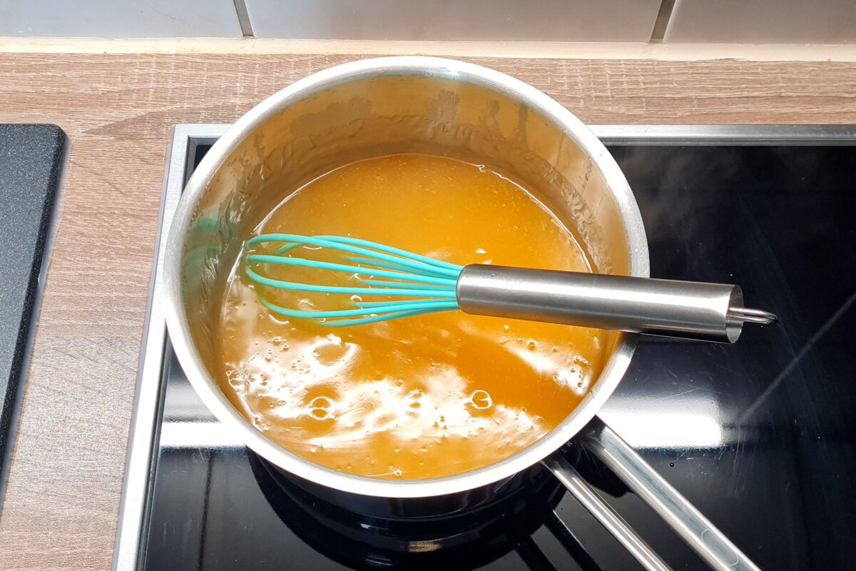 Den restlichen Saft mit der Speisestärke klümpchenfrei verrühren und bereitstellen. Den Maracujasaft im Topf aufkochen lassen und mit dem vorbereitete Speisestärkegemisch abbinden, bis die Masse andickt.
