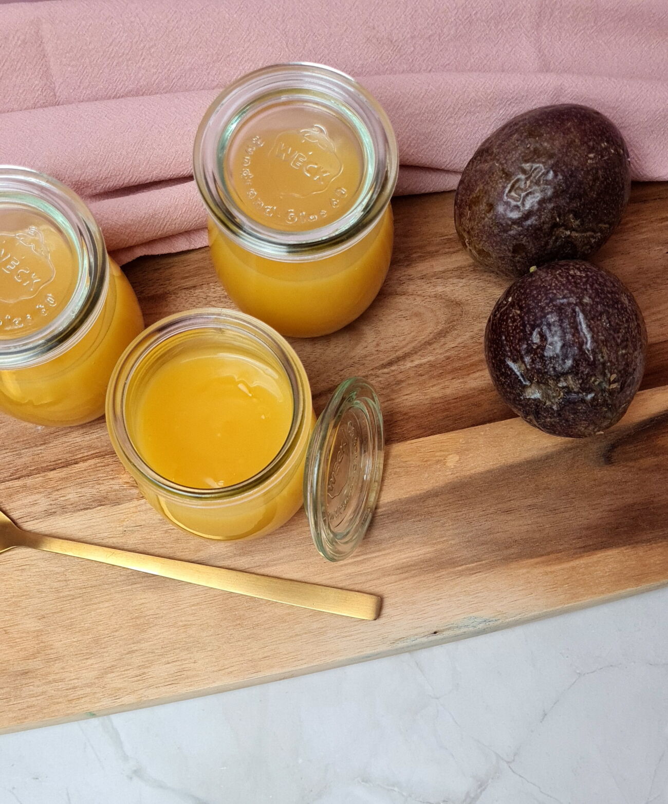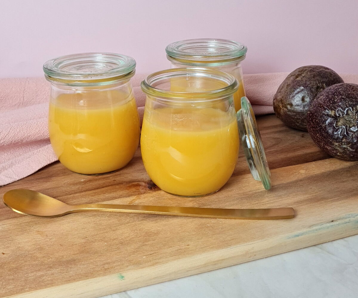 Anschließend den Topf vom Herd nehmen, die kalte Butter in kleinen Stücken dazugeben und vollständig einrühren. Das Maracujacurd in kleine Gläser abfüllen, mit Frischhaltefolie abdecken und für die Weiterverarbeitung vollständig auskühlen lassen.
