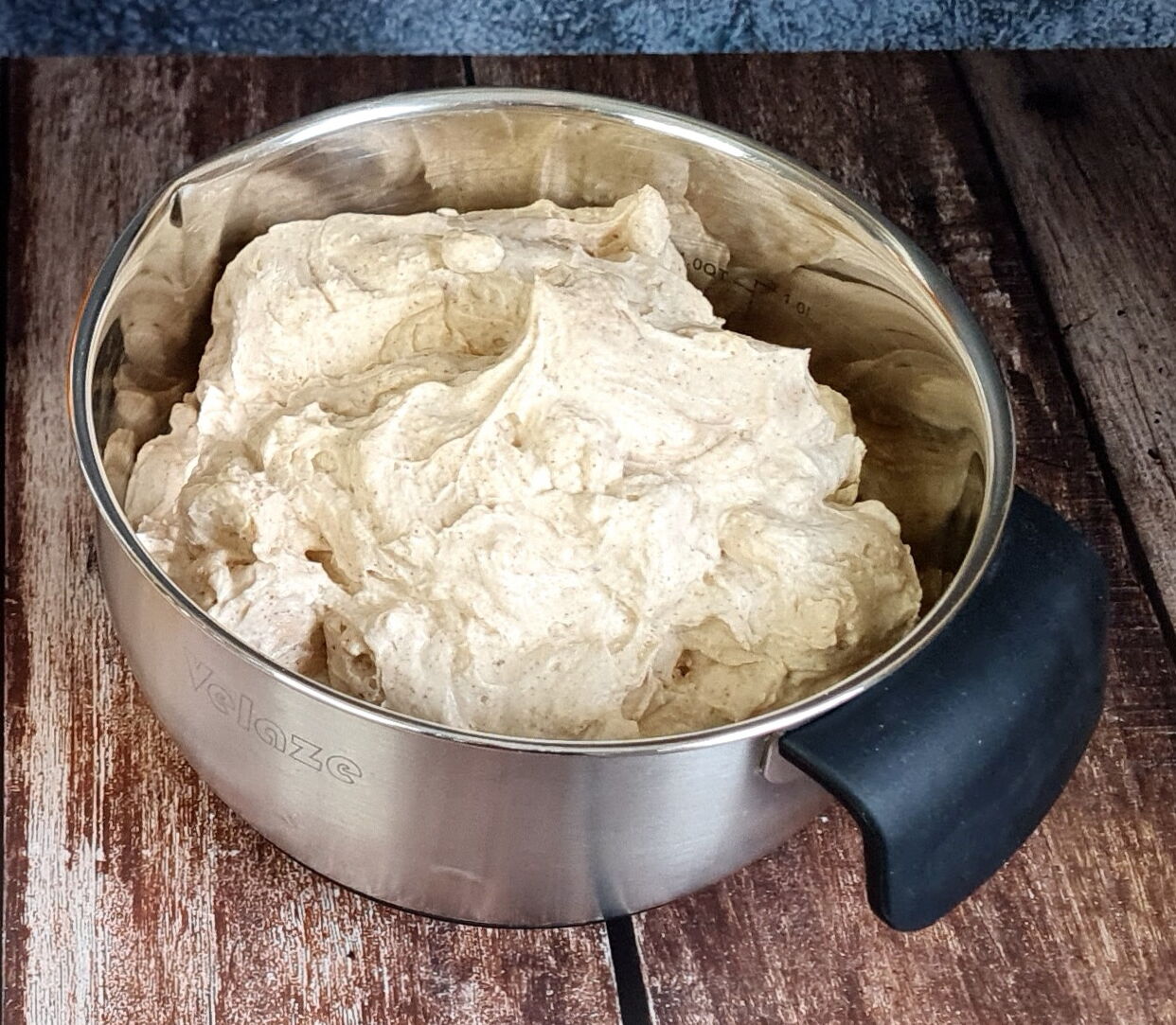 Anschließend die Mascarpone mit dem Puderzucker, Sahnesteif, den Gewürzen und dem Vanillezucker cremig schlagen. Die Schlagsahne seperat halbsteif aufschlagen und dann unter die Mascarpone heben. Nun ¼ der Mascarponecreme mit dem Kürbispüree vermischen und beide Cremes für die Weiterverarbeitung bereit stellen.