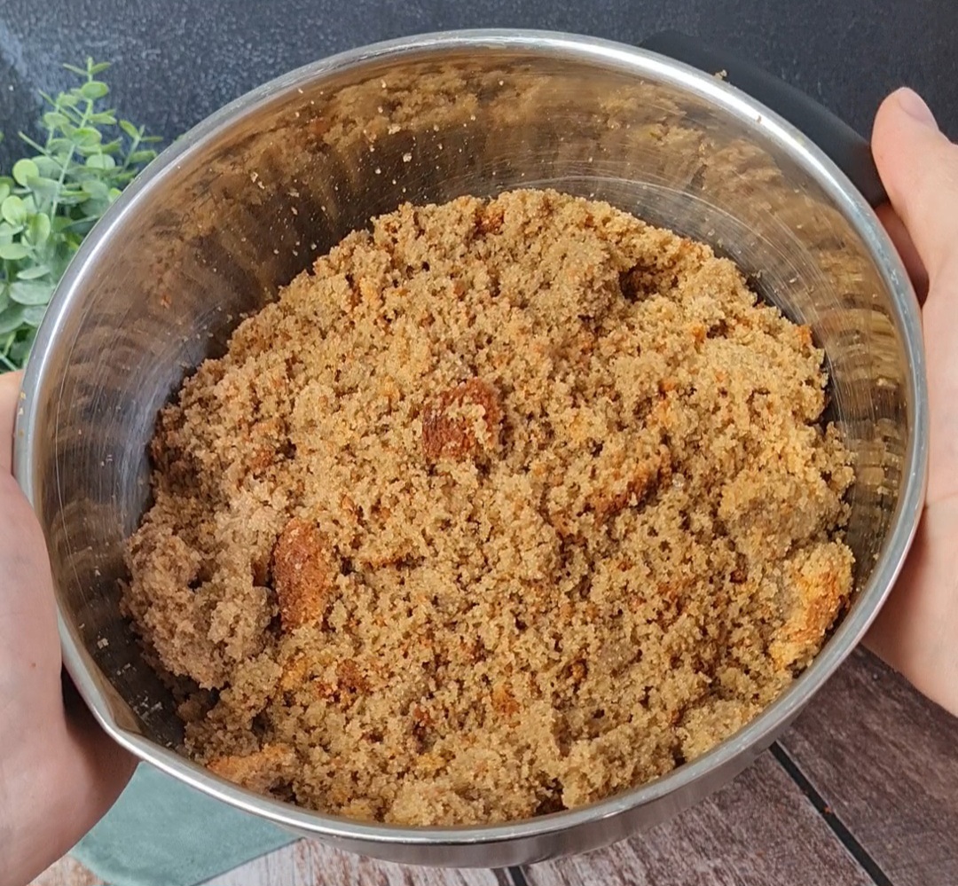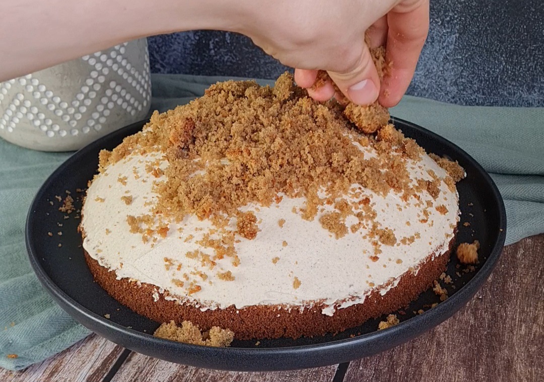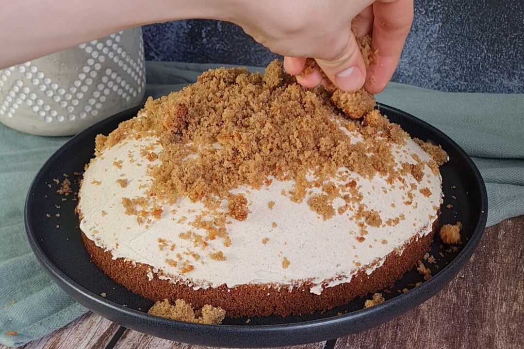 Zu guter Letzt den Kuchen mit einer Decke aus Kuchenkrümeln dekorieren und bis zum Servieren kühl stellen.