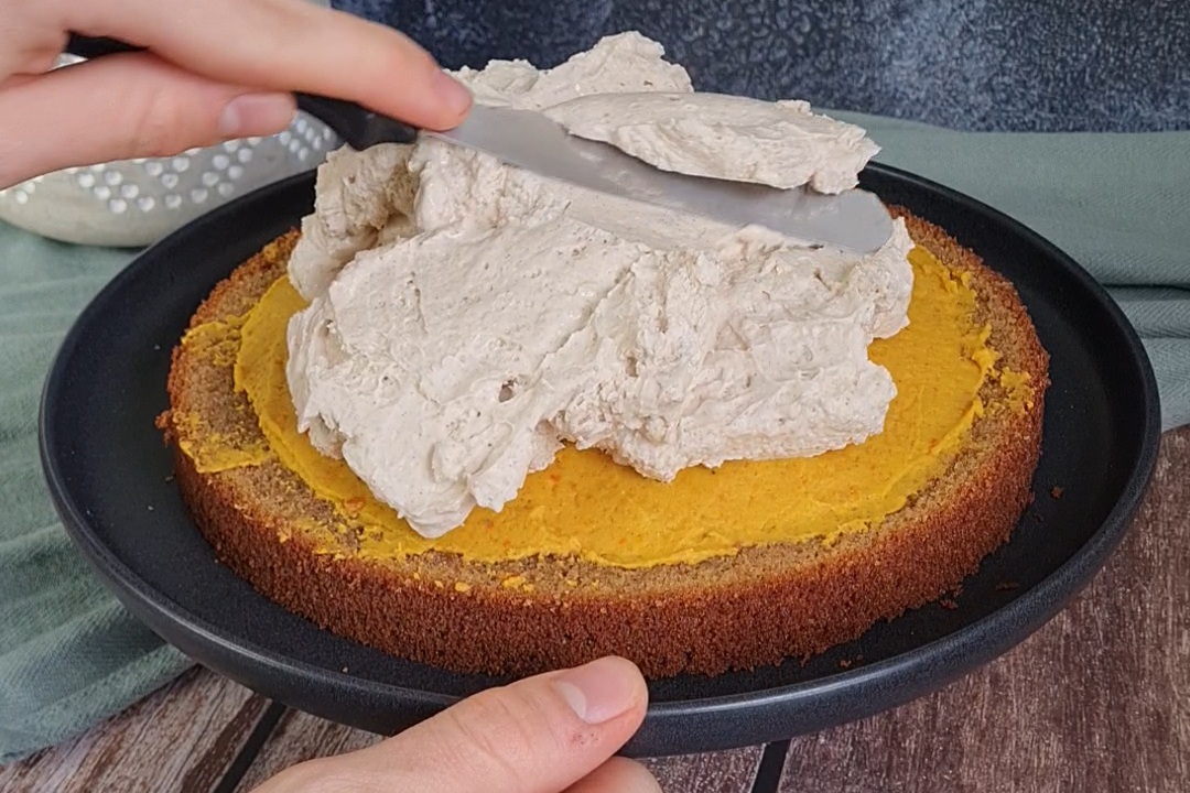 Die Kürbiscreme kommt nun in den ausgehöhlten Rührteigboden und danach wird die Mascaponecreme kuppelförmig darauf verteilt und glatt gestrichen.