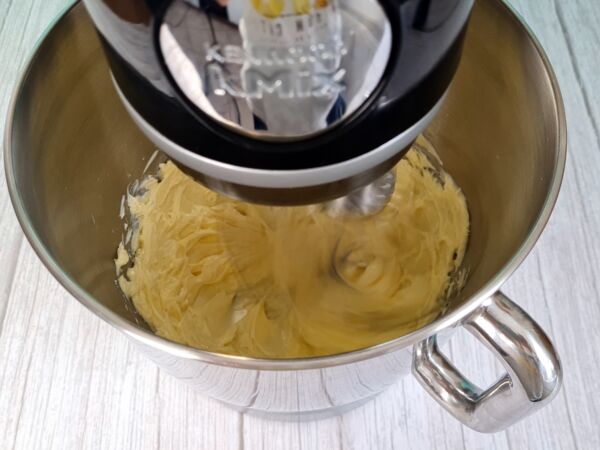 Die weiche Butter für rund 10 Minuten mit dem Handrührgerät oder in der Küchenmaschine aufschlagen, dabei achten das am Ende keine gelben Butterflocken mehr zu sehen sind.