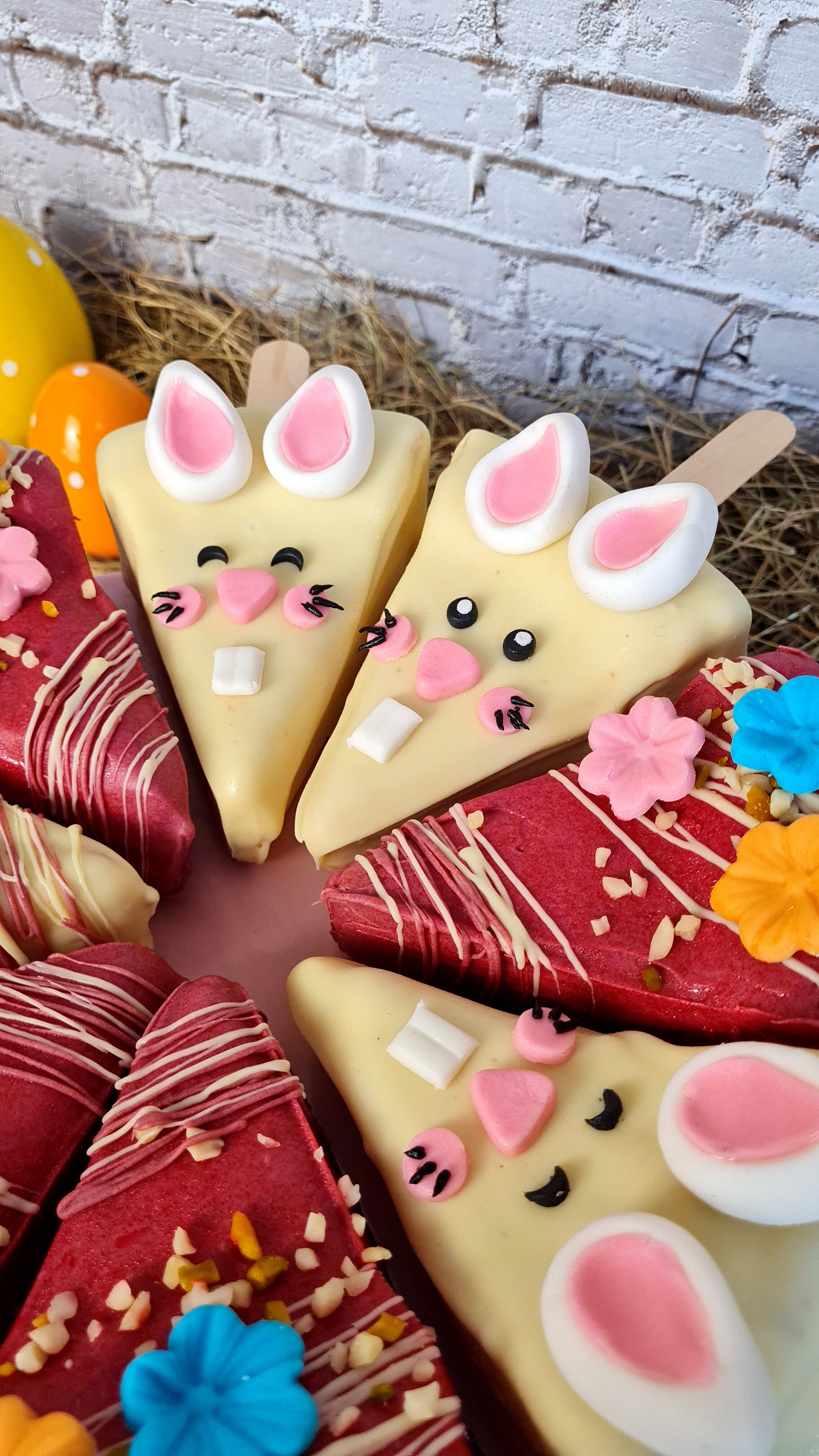 Perfekt zur Osterzeit gibt es diese süßen Motiv-Cakesicles bestehend aus einem cremigen Käsekuchen. Ummantelt mit Kuvertüre und dekoriert mit kleines Osterelementen aus Fondant.