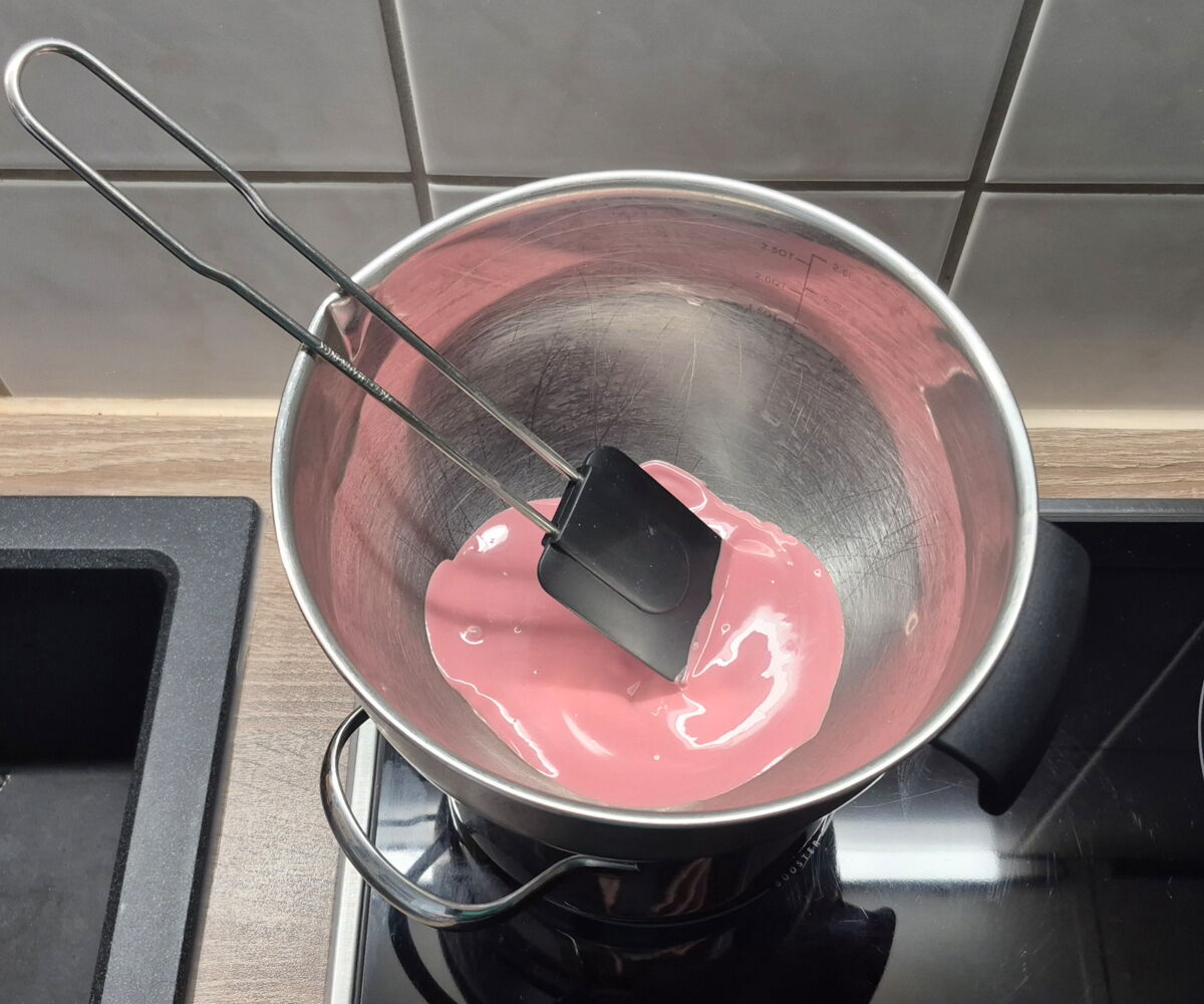 Zuerst die Ruby Schokolade kleinhacken und ⅔ davon über einem nicht zu heißen Wasserbad schmelzen lassen.