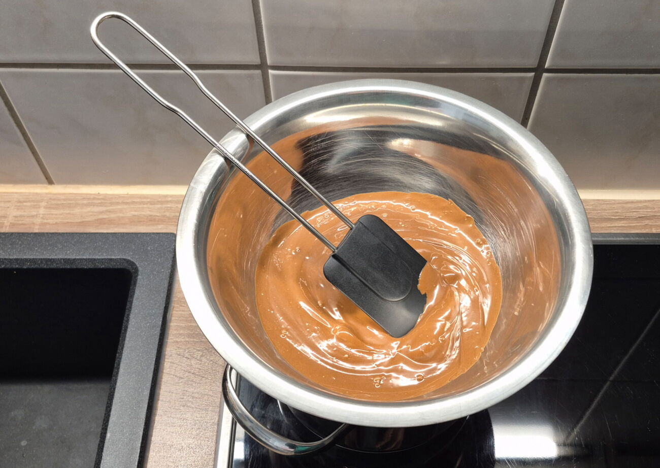 Sobald die Schokolade flüssig ist, die Schüssel vom Wasserbad nehmen und die Masse mit dem restlichen Drittel an Schokolade herunterkühlen.