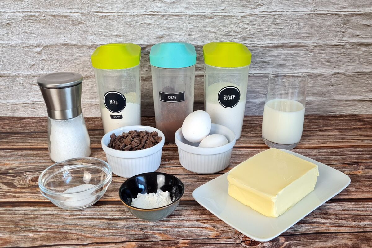 Das Weizenmehl mit dem Backkakao und dem Backpulver vermischen, sieben und zusammen der Milch zur aufgeschlagenen Masse geben. Alles miteinander verrühren, bis ein glatter Teig entstanden ist.