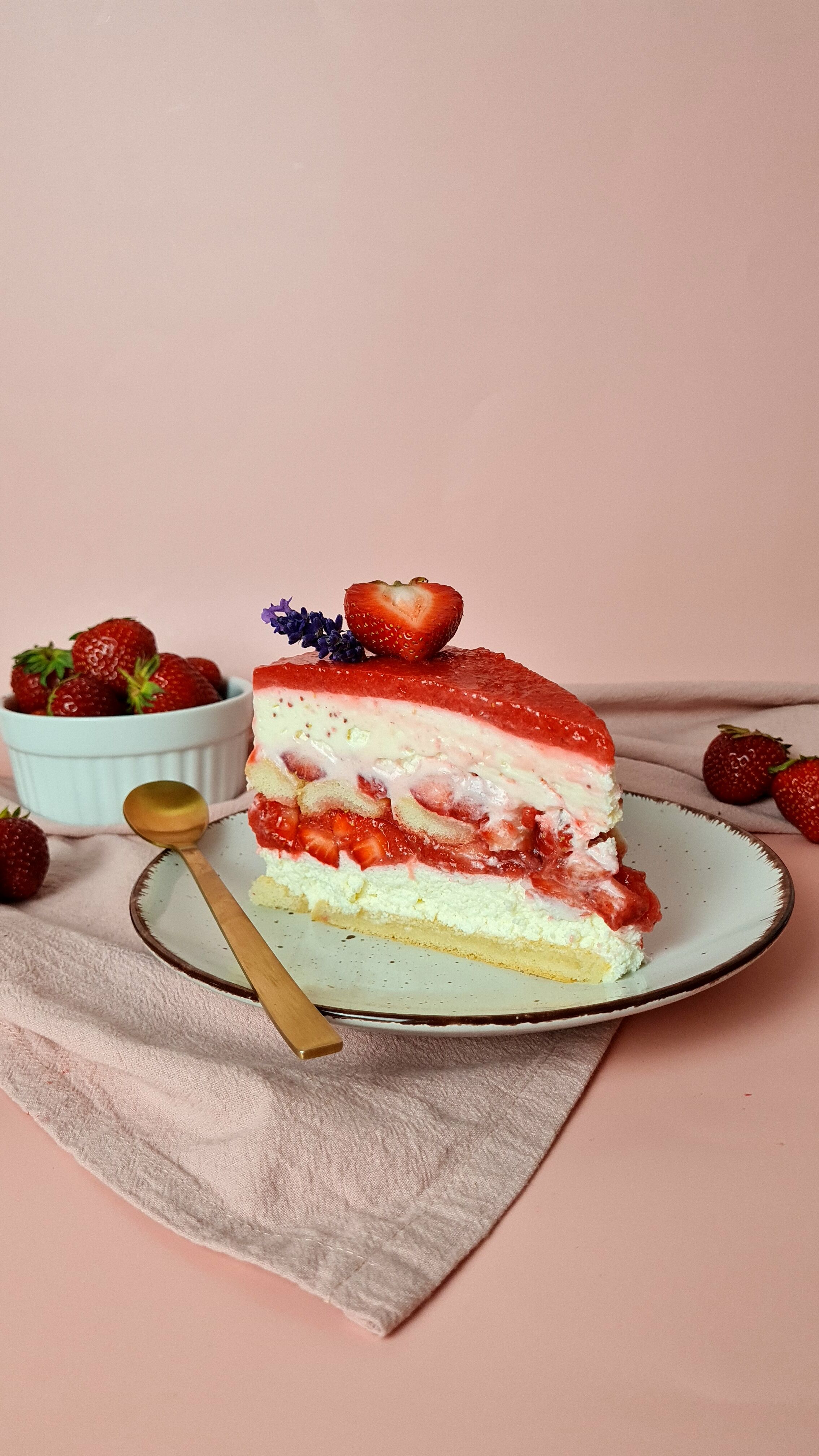 Danach die Hälfte der Creme auf die Löffelbiskuits verteilen, vollständig mit etwas vom Erdbeerpüree und den Erdbeerstückchen belegen und glattstreichen. Eine weitere Schicht Löffelbiskuits auf den Erdbeeren verteilen und mit den restlichen Erdbeerstückchen belegen. Die restliche Creme darauf verteilen und glattstreichen. Anschließend das restliche Erdbeerpüree auf der Torte verteilen und vorsichtig glattstreichen.