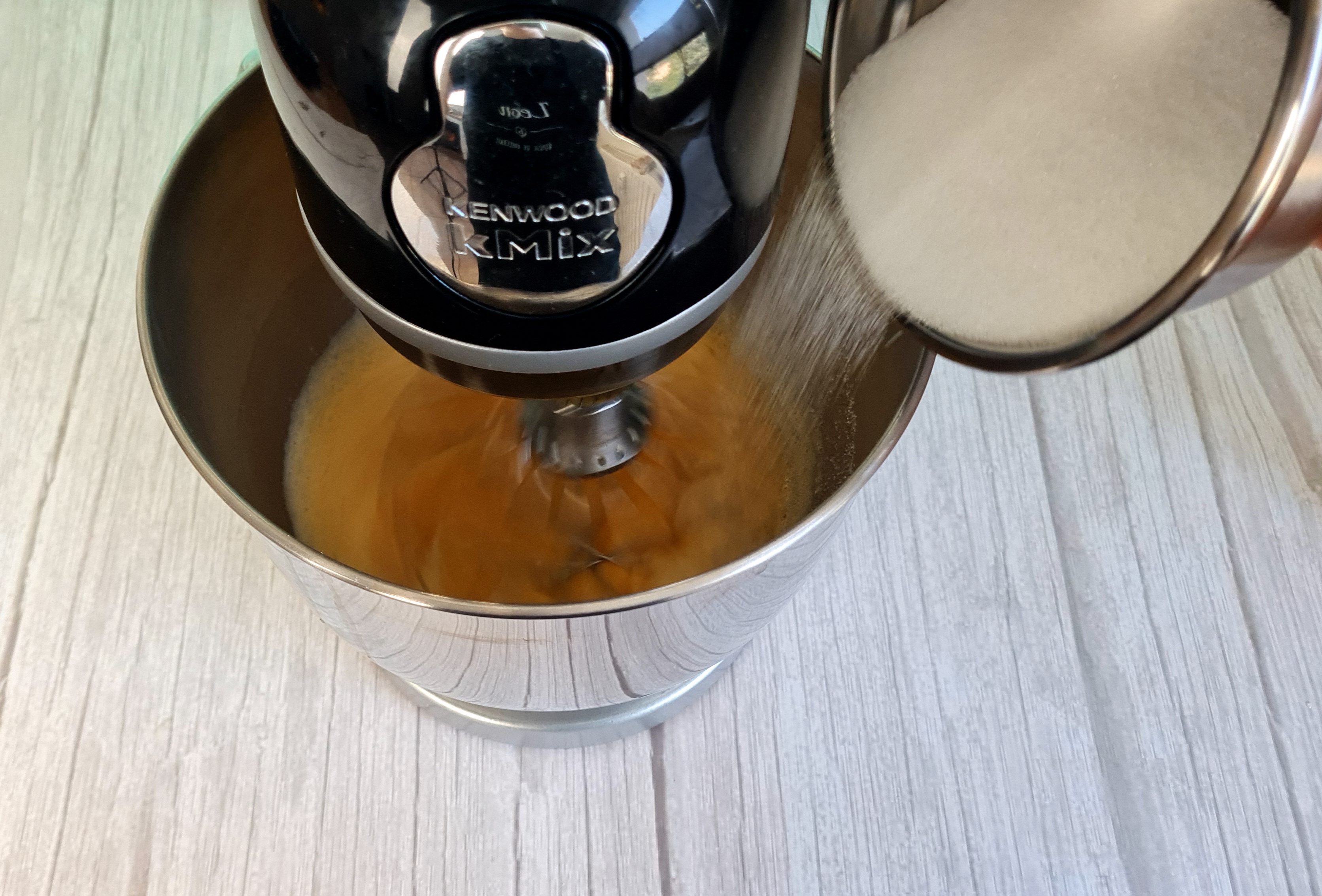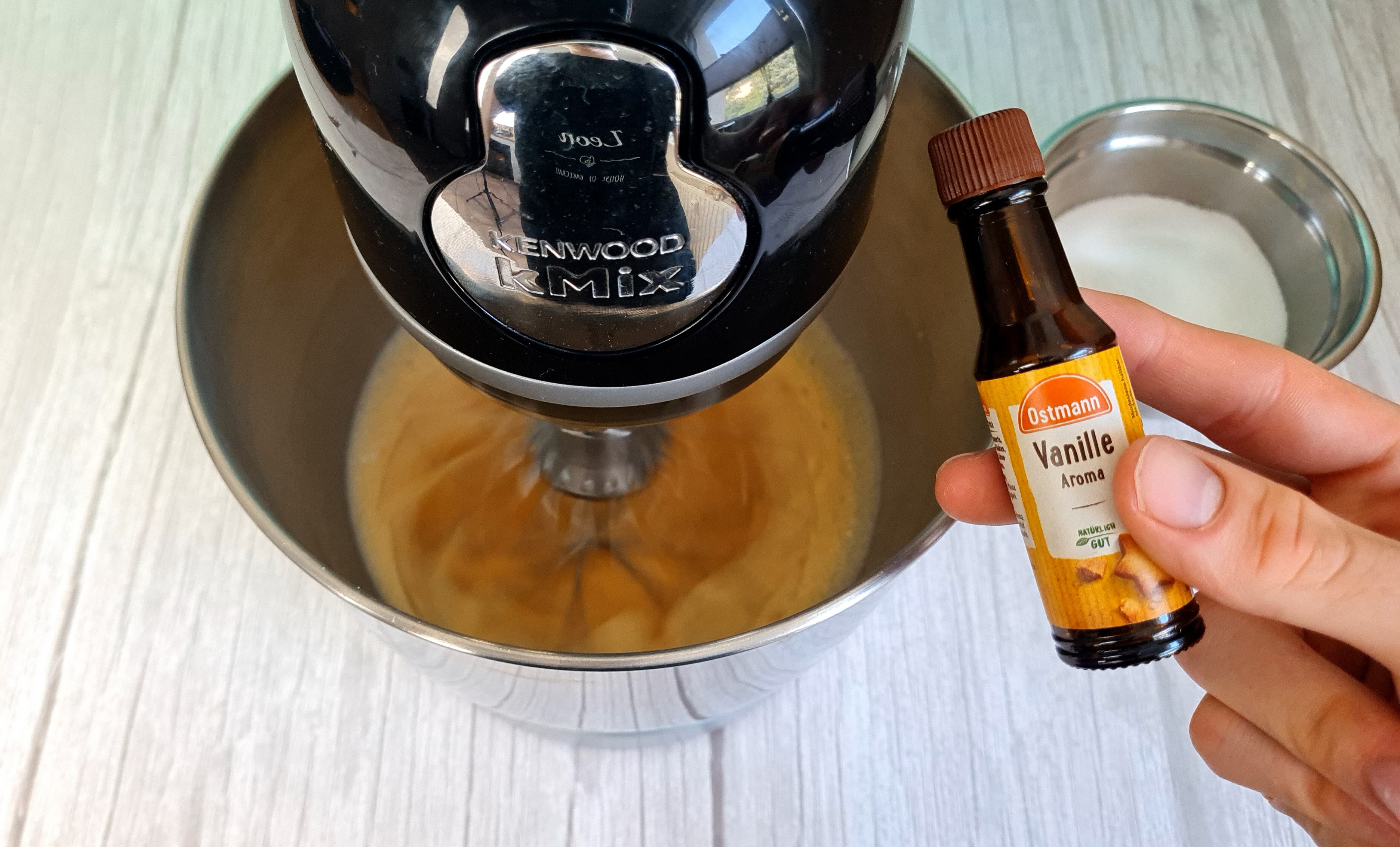 Für den Biskuitteig die Eier mit einer Prise Salz auf höchster Stufe aufschlagen und langsam den Zucker, den Vanillezucker und das Aroma nach und nach dazugeben. Das Ganze für ca. 12-15 Minuten dick cremig aufschlagen, bis sich das Volumen verdreifacht hat.