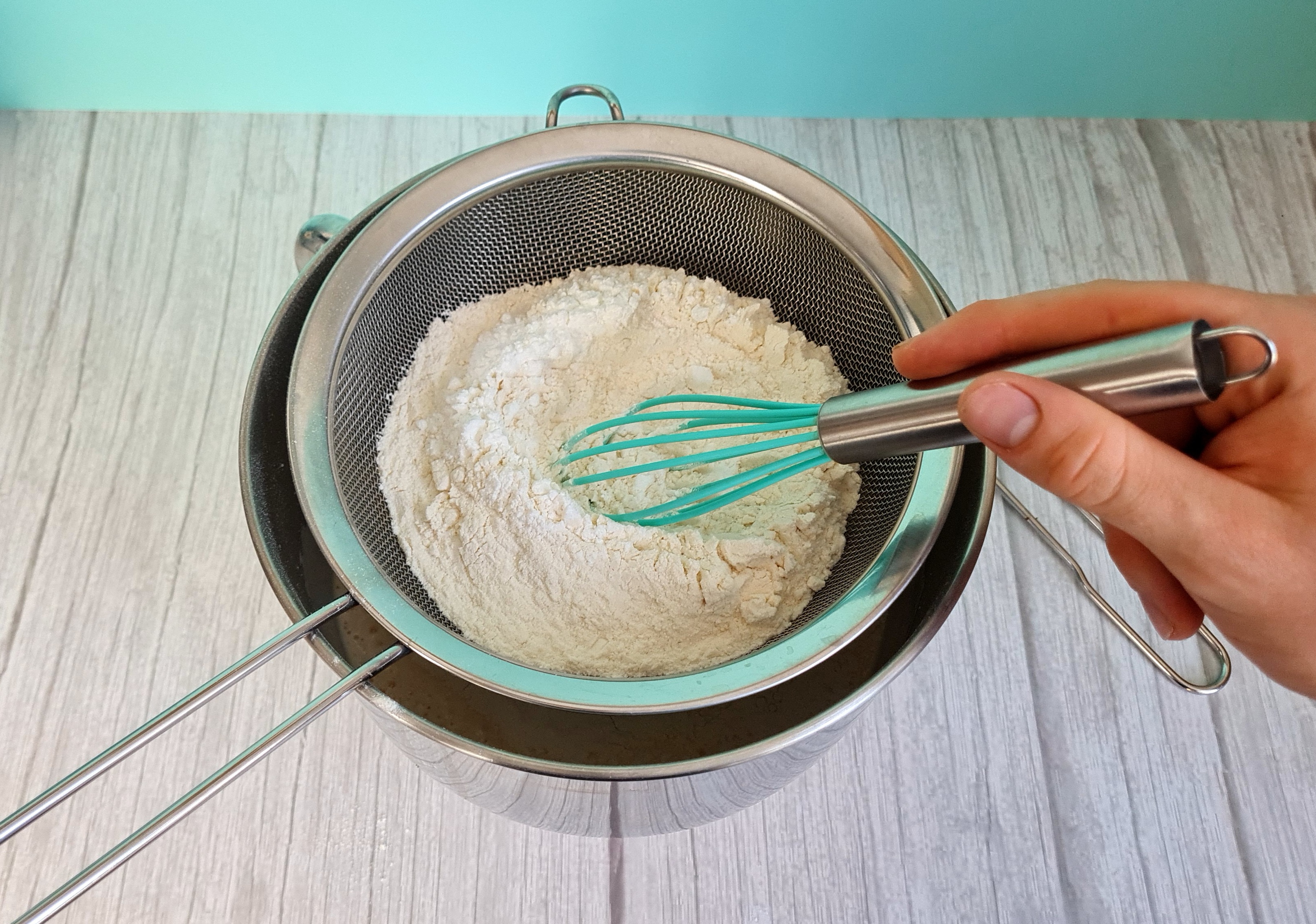 Währenddessen das Weizenmehl mit dem Backpulver in einer seperaten Schüssel sieben. Nun die trockenen Zutaten vorsichtig unter die fluffige Ei-Masse heben, ohne das zu viel Luft entweicht!