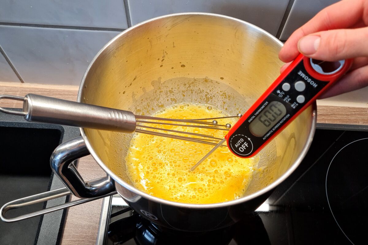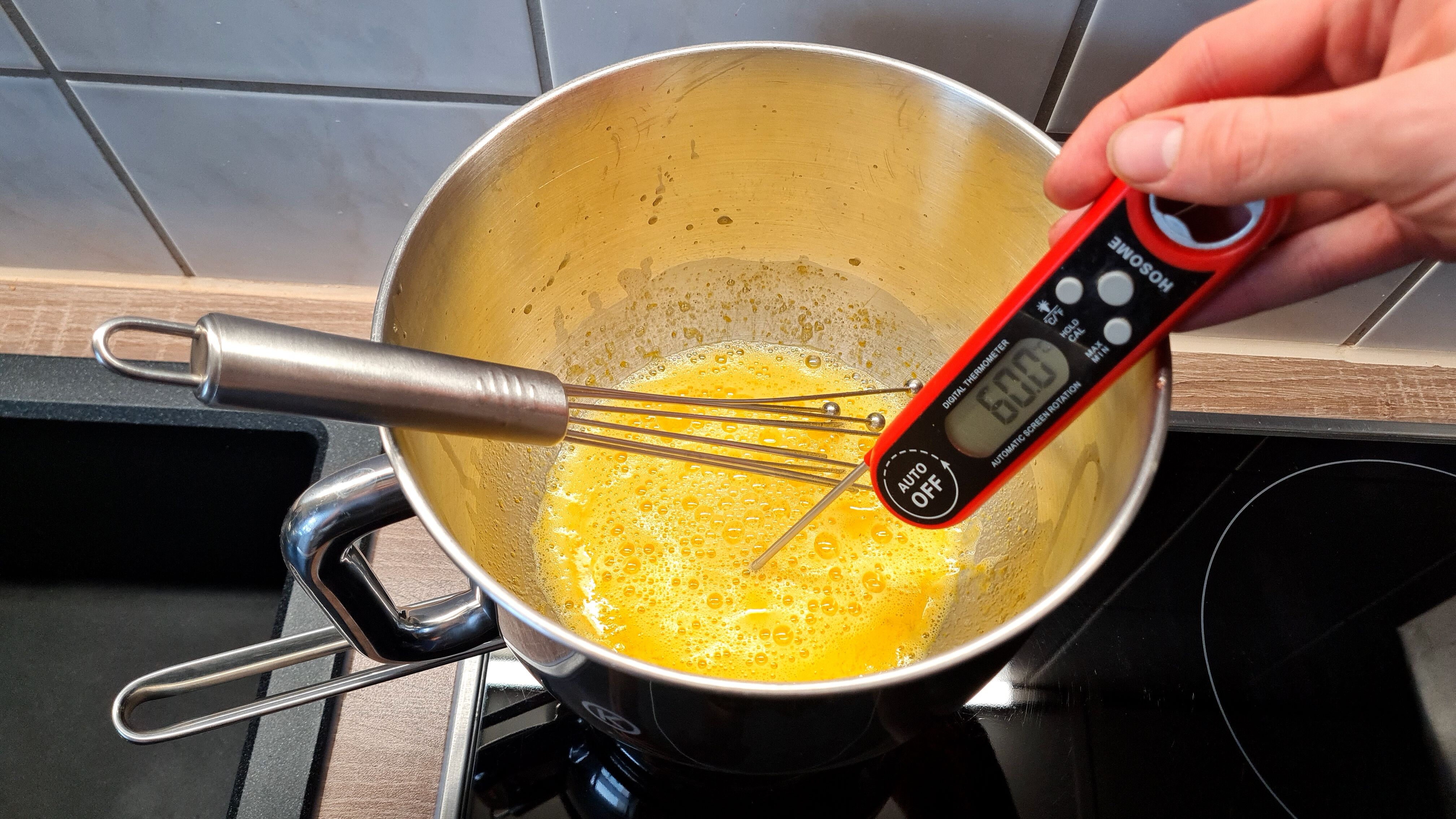 Die Eier mit einer Prise Salz, dem Zucker, etwas Vanillepaste und 2 El Zitronensaft in einer Metallschüssel über dem Wasserbad auf 60°C erhitzen.