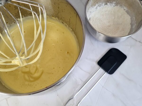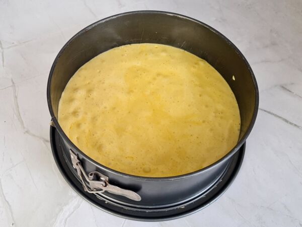 Die Zucker-Ei-Masse vom Herd nehmen und für etwa 10 Minuten aufschlagen. Währenddessen das Weizenmehl zusammen mit der Speisestärke und dem Backpulver vermischen, sieben und vorsichtig unter die aufgeschlagene Zucker-Ei-Masse heben. Anschließend die abgekühlte Butter in den Teig einrühren. Den Biskuitteig in die vorbereitete Springform füllen und im vorgeheizten Backofen für etwa 25 Minuten backen lassen.