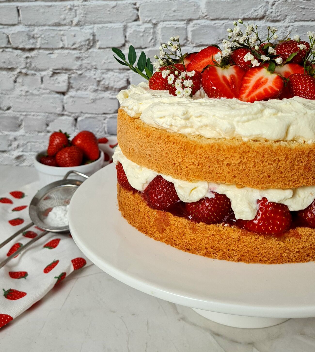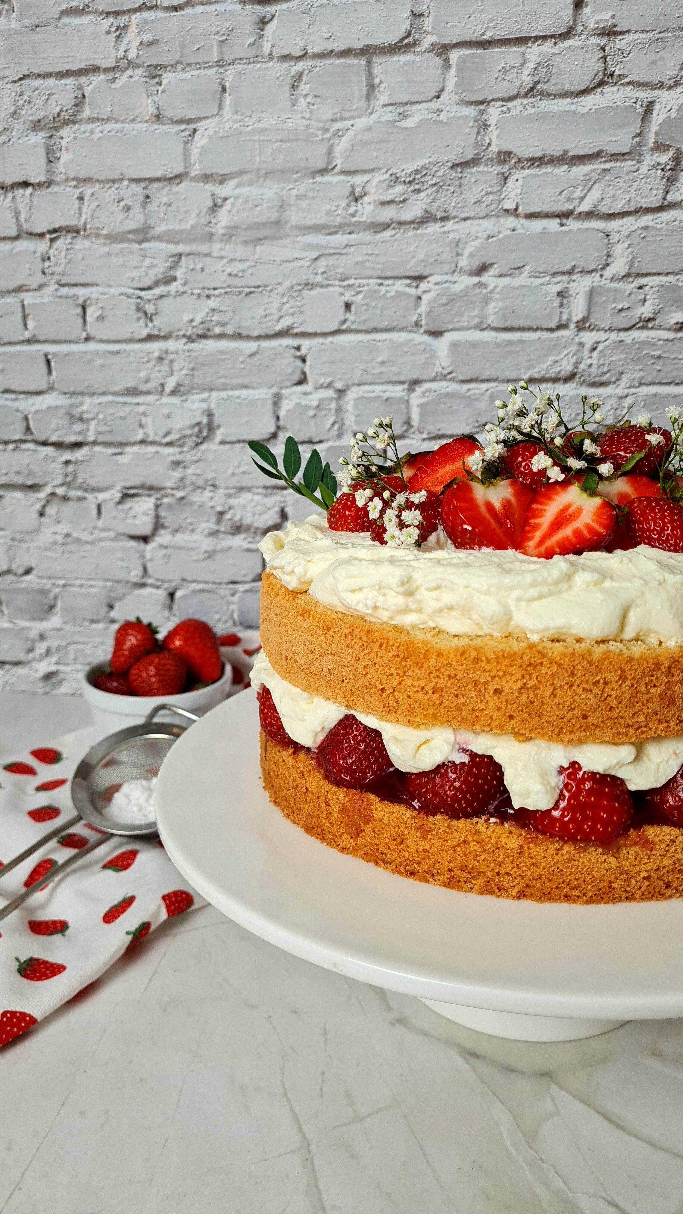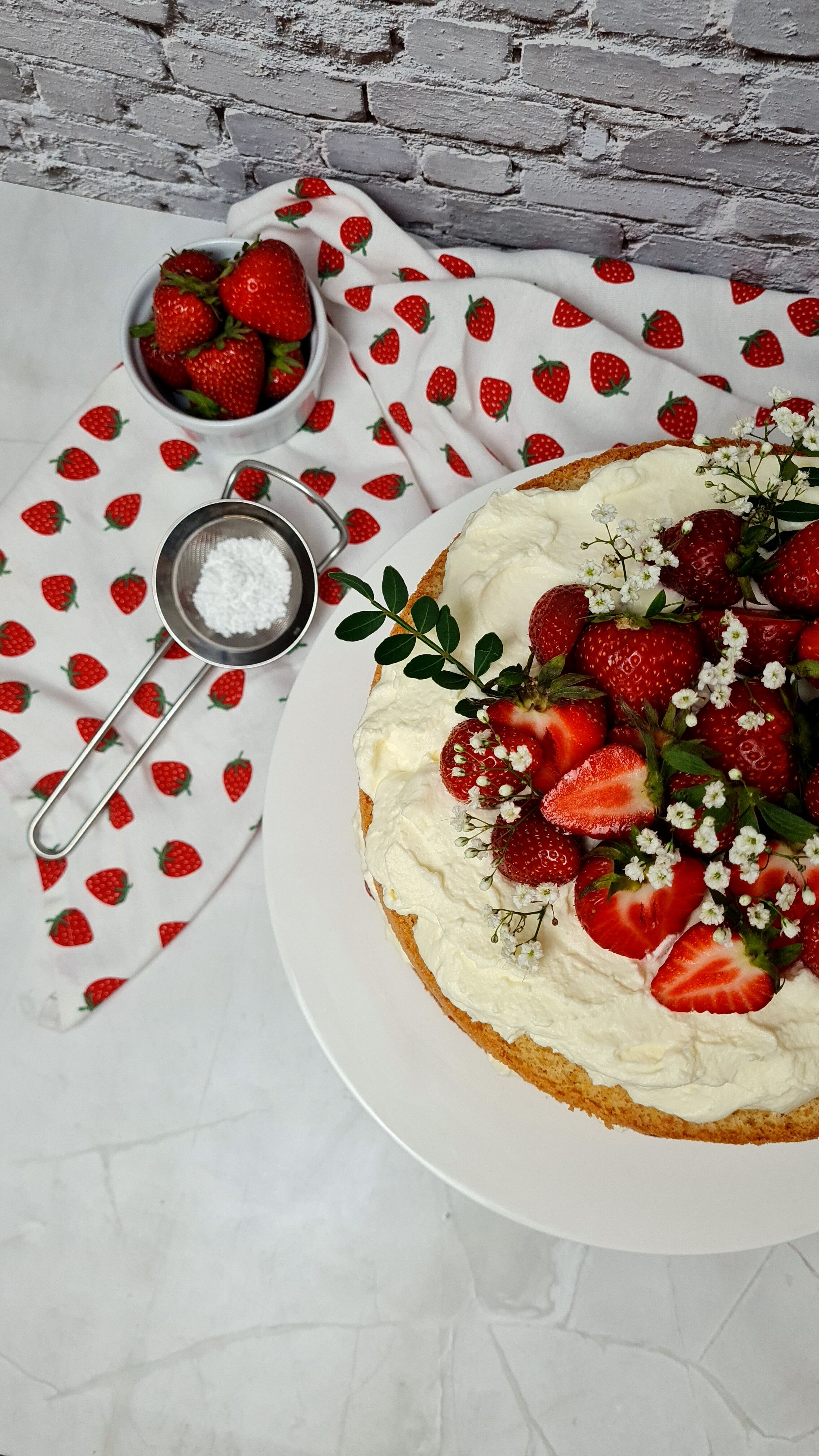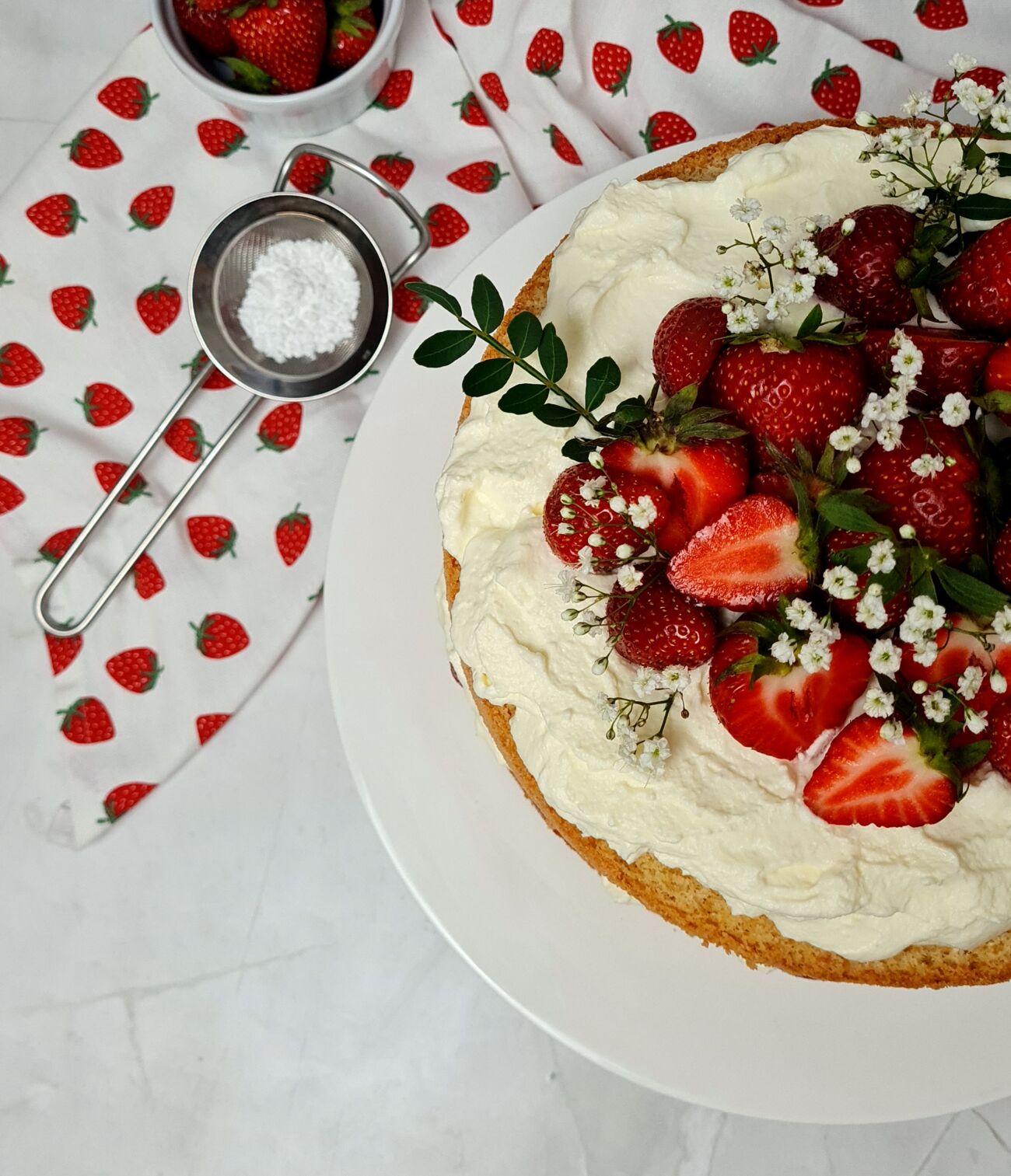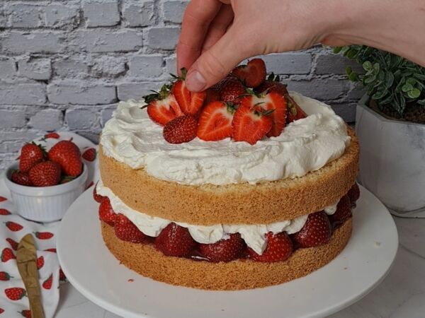 Den zweiten Boden auflegen und die restliche Schlagsahne mittig auf der Torte verteilen. Jetzt noch ein paar Erdbeeren waschen, abtrocknen und nach Belieben dekorativ belegen. Zum Schluss mit etwas Puderzucker bestäuben und euren Liebsten servieren.