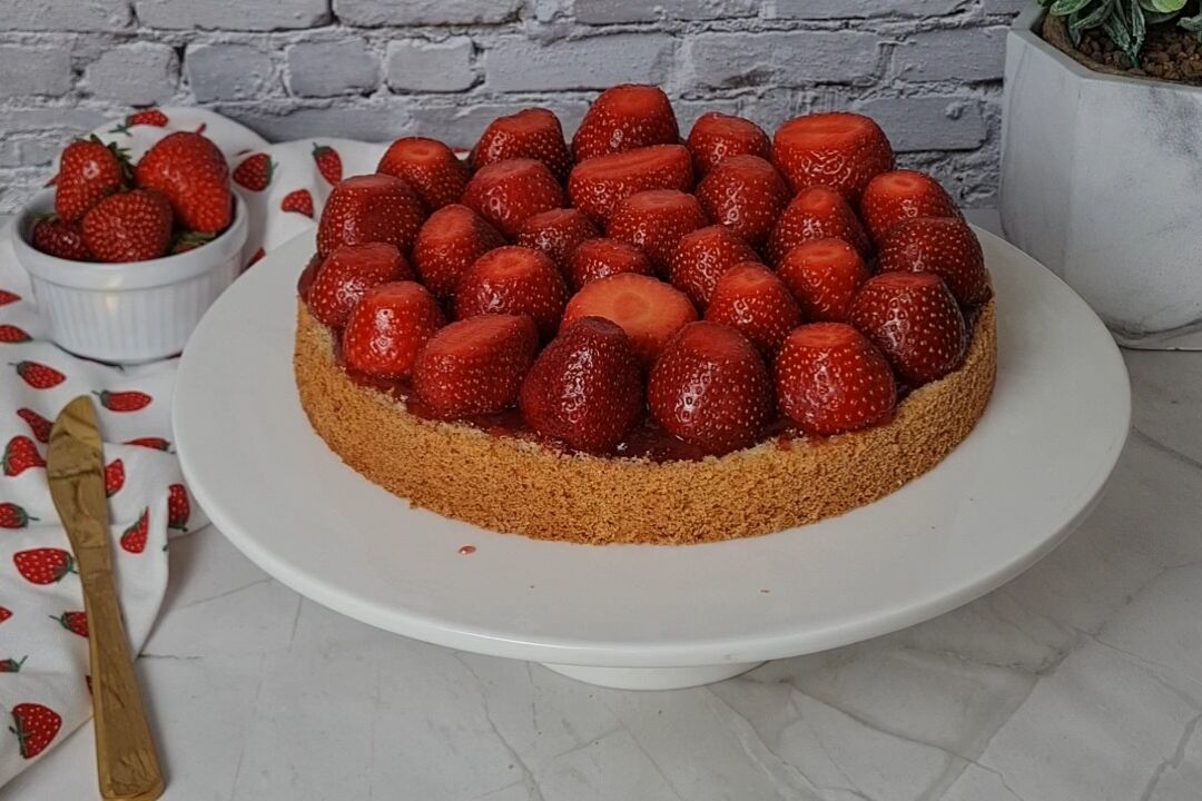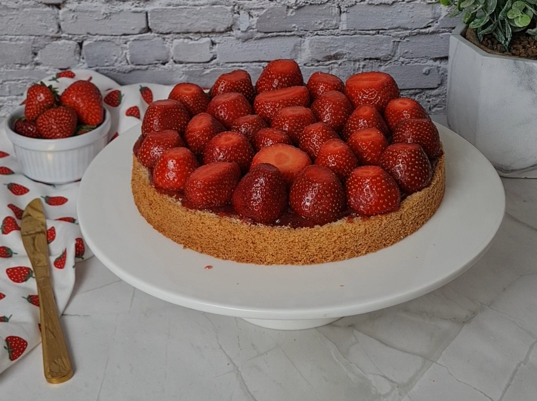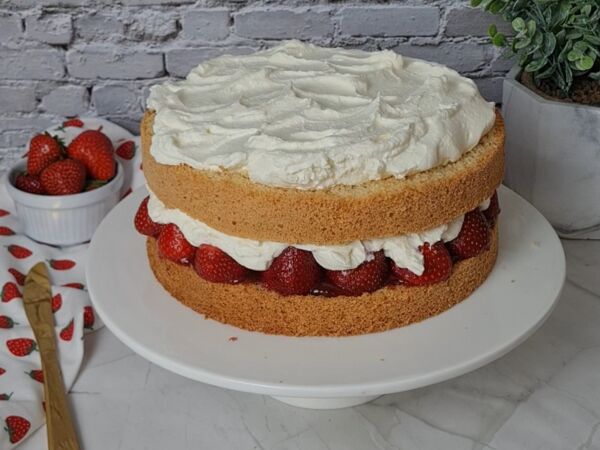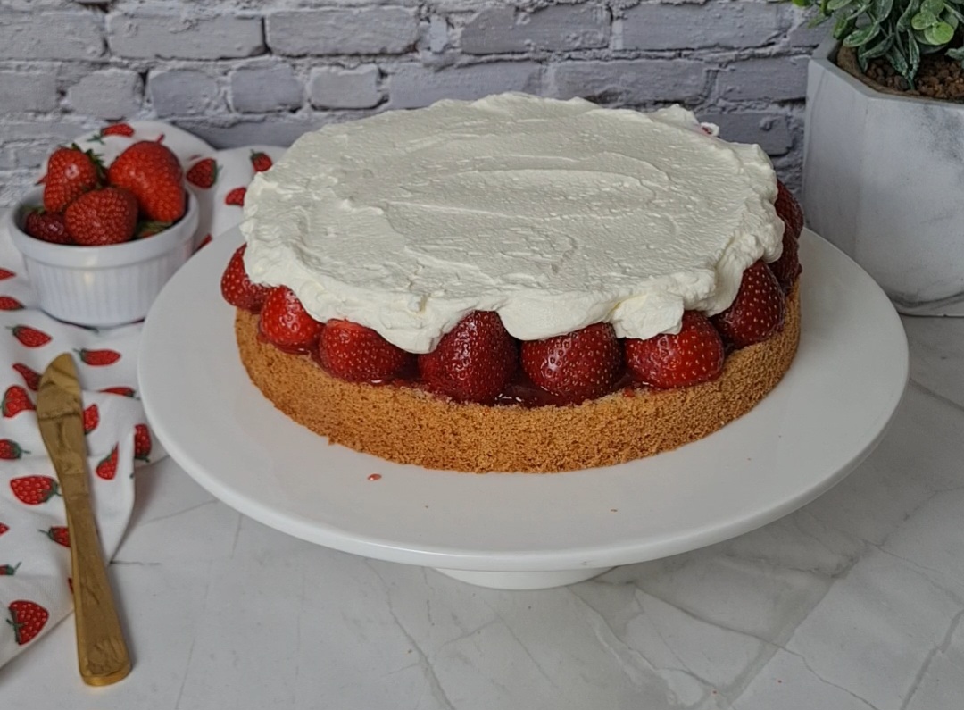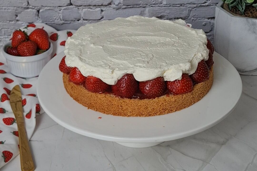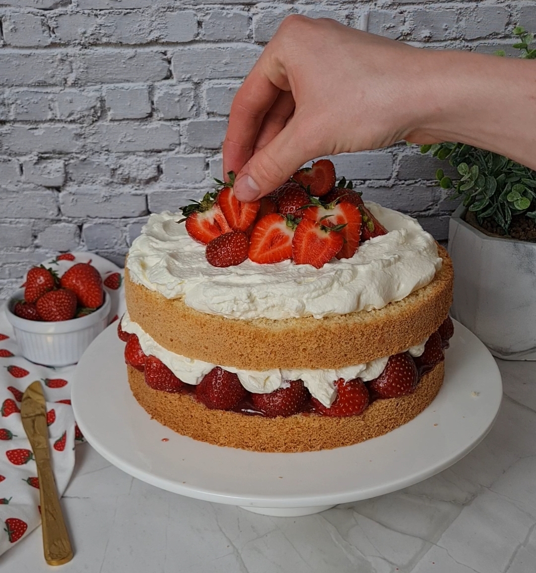 Den zweiten Boden auflegen und die restliche Schlagsahne mittig auf der Torte verteilen. Jetzt noch ein paar Erdbeeren waschen, abtrocknen und nach Belieben dekorativ belegen. Zum Schluss mit etwas Puderzucker bestäuben und euren Liebsten servieren.